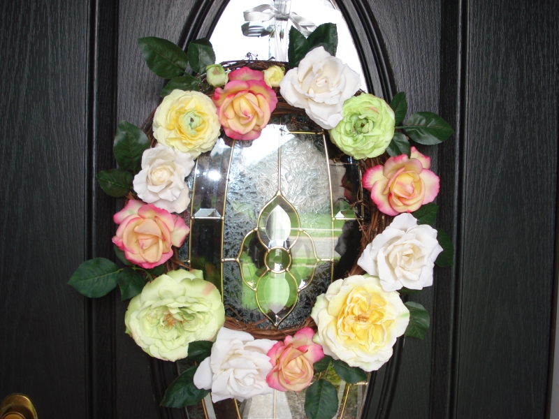 I’d been wanting a spring/summer wreath since Easter was over and I took down the little egg decoration that had been hanging on the front door. The problem wasn’t that I couldn’t find a wreath I like. The problem was that I wasn’t willing to spend $50 for it. One day while showing Chad a particular wreath that I thought was pretty nice, he mentioned that I could probably make one just like it. I thought, he’s right! So, that’s exactly what I did. I went to Hobby Lobby during a time when their floral stuff was half off. I purchased the wreath base and then picked out flowers that I thought would look gorgeous together. I brought it all home and put it together, hot-gluing to secure the flowers. I tied a ribbon on the back to hang it up, and it is now adorning our front door. I have to say that I am more pleased with this wreath than any other that I saw to purchase. I’m so glad I was able to make it just the way I wanted, and, the best part, for under $25! That might seem like a lot, but comparable wreaths that I liked and wanted to buy were originally $80-$100. Even on sale, they don’t beat the price of this Jennie-made wreath. Feel free to stop by and admire it or wave to it. There are only a couple more months until the fall decor goes up.