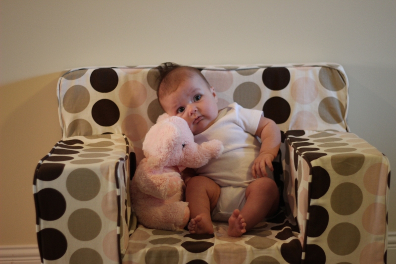 Recently, Chad and I have noticed how much Piper loves her “happy bear” that hangs above her changing table. It’s small, and if you push a button, it lights up and sings “I am a bear, a happy bear, a hungry bear, a sleepy bear. I am a bear, a happy bear. Oh won’t you play with me.” When she’s on the table, she will look over at it, and when you make it start to sing, she always smiles. It is so cute. I’d like to say I picked this toy out for her, but the truth is someone found it in the parking lot at my school and the secretary told me to take it because kids were driving her crazy playing with it after school. I randomly decided to hang it on an existing nail one day and that is where it will stay so that she can not put it in her mouth.